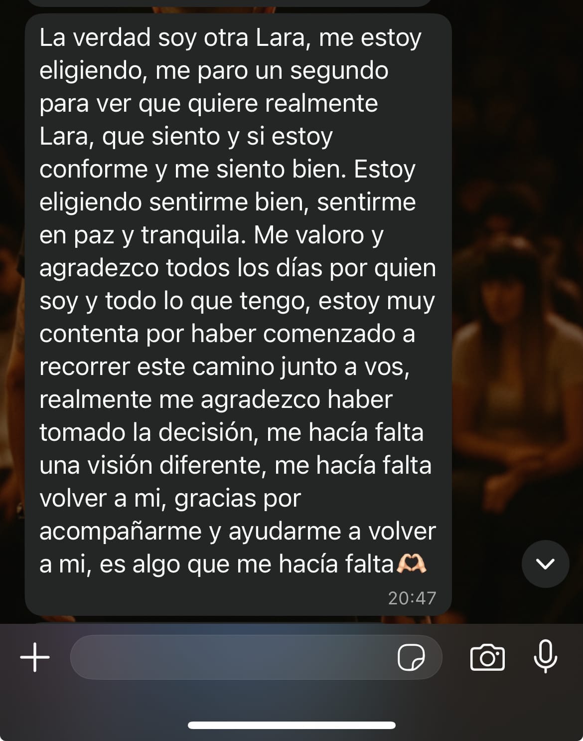 Una conversación de 20 minutos donde vemos tu situación actual y lo que querés transformar. Un espacio seguro, sin presión. Solo claridad.