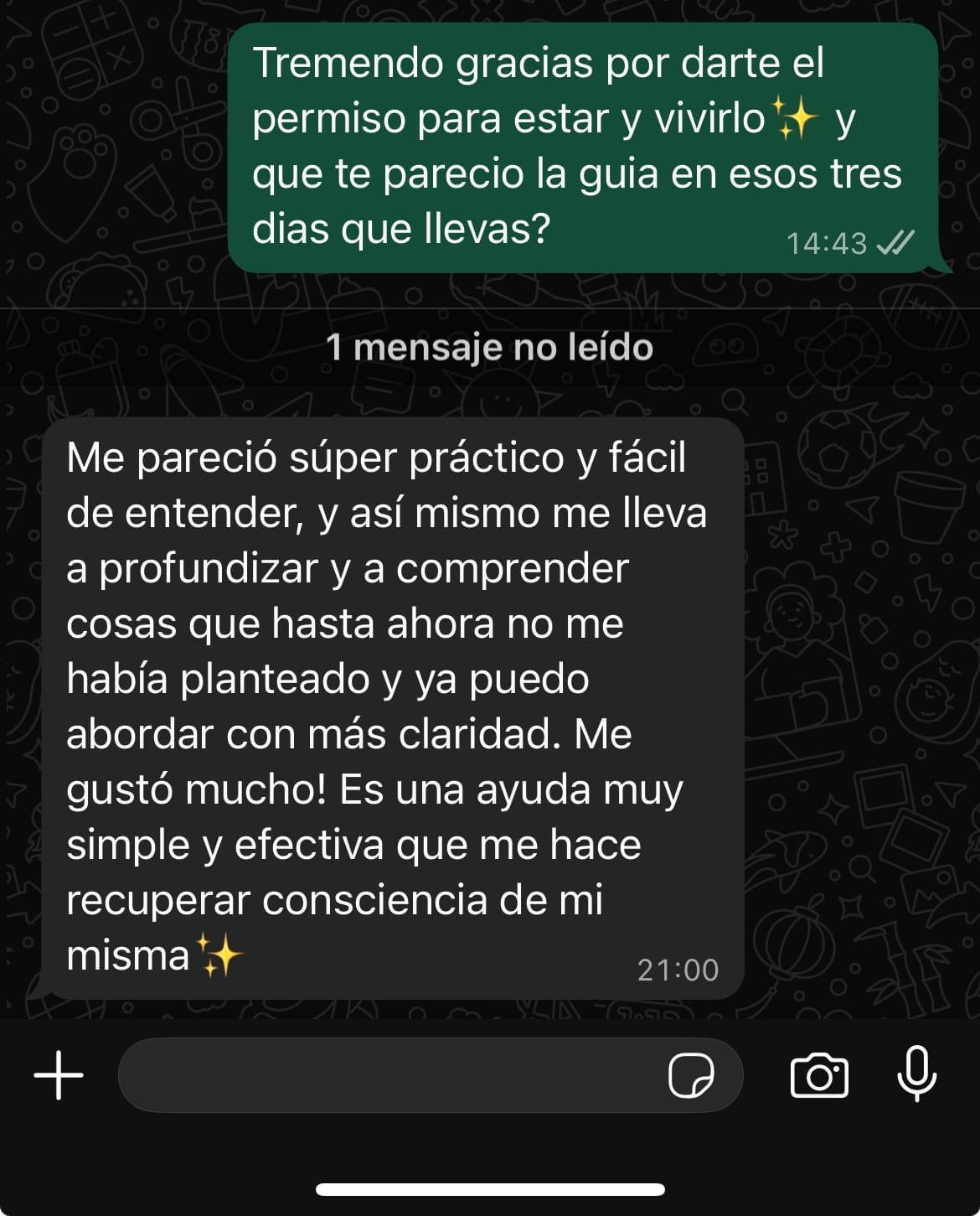 Disponibilidad por WhatsApp para dudas, emociones y seguimiento. No estás sola/o durante la semana.